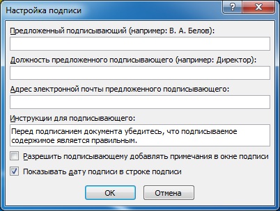 Появится диалоговое окно Настройка подписи. В нём можно ввести информацию о лице, которое будет добавлять подпись. Эти сведения будут отображены в строке подписи в документе. Заполнять все пункты необязательно.